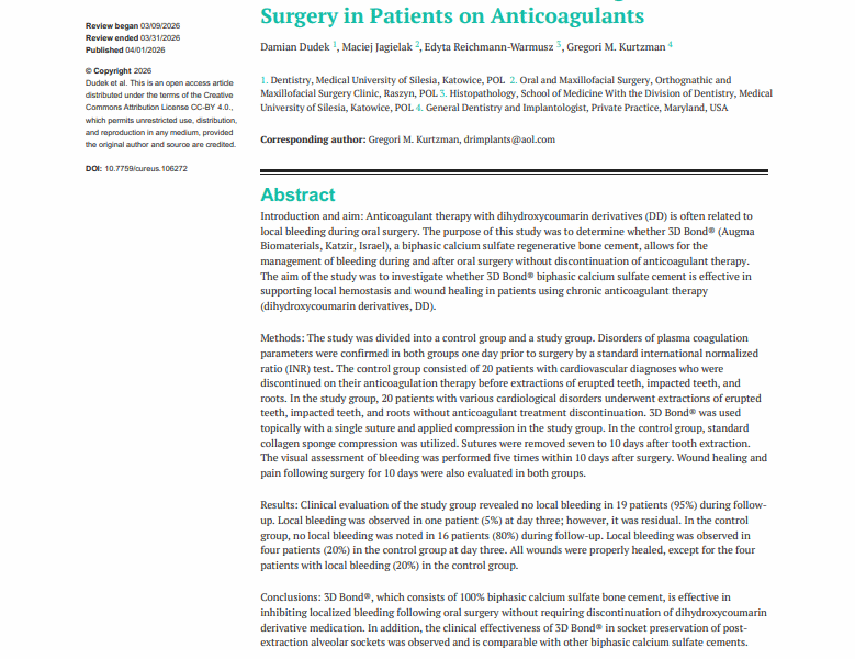 Damian Dudek • Maciej Jagielak • Edyta Reichmann-Warmusz • Gregori M. Kurtzman Abstract: Introduction and aim: Anticoagulant therapy with dihydroxycoumarin derivatives (DD) is often related to local bleeding during oral surgery. The purpose of this study…