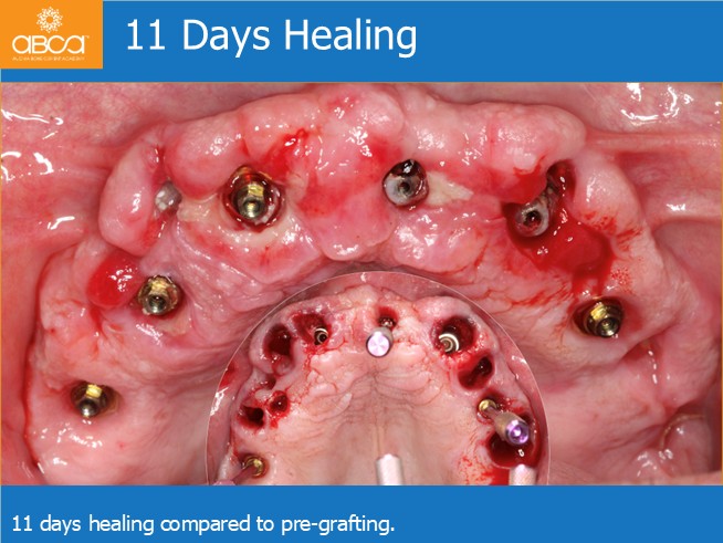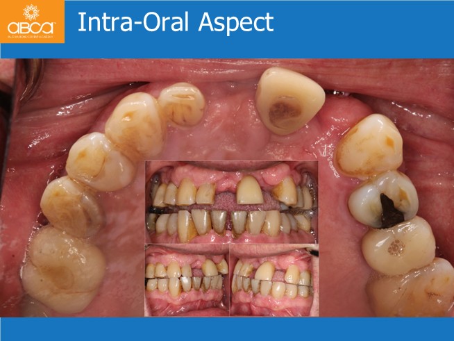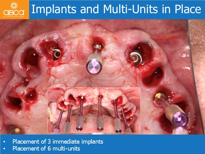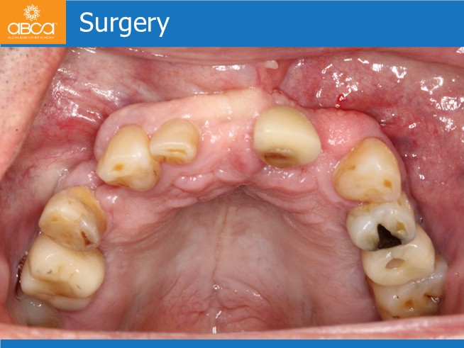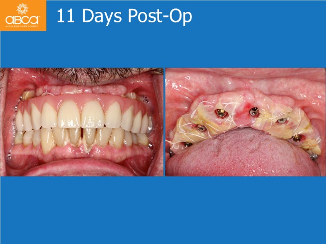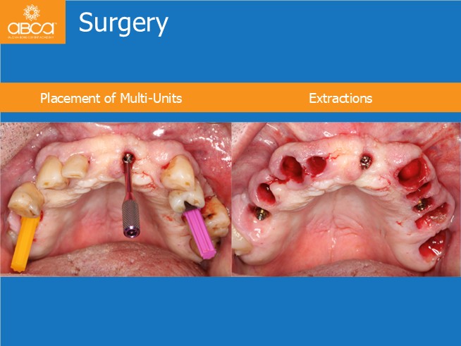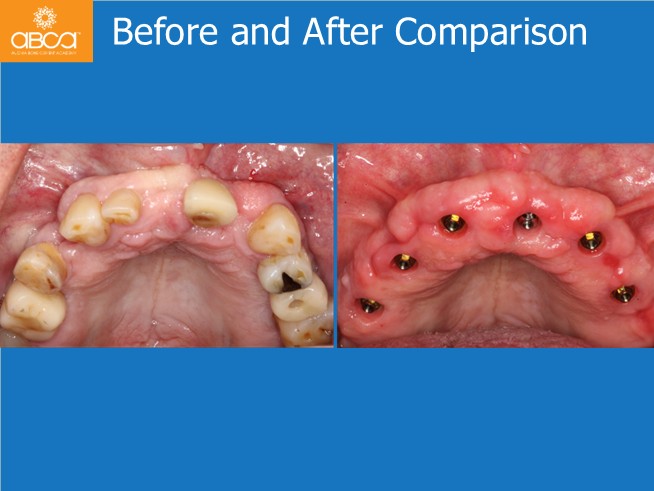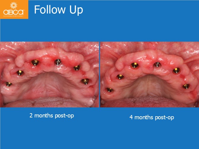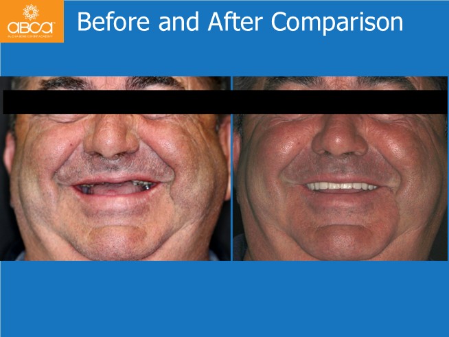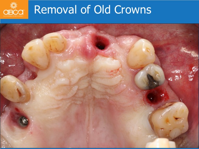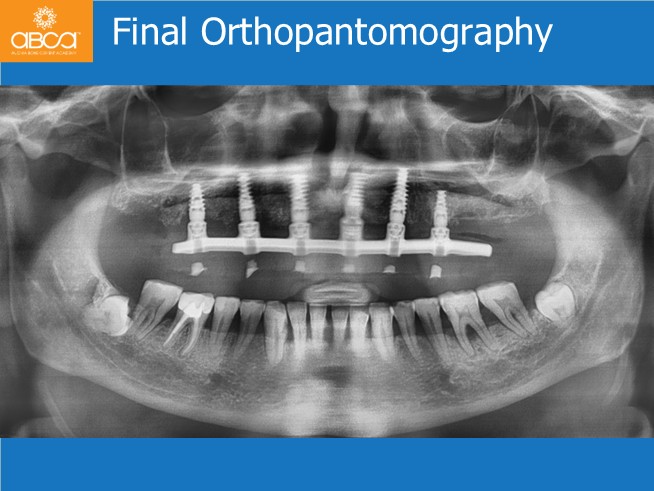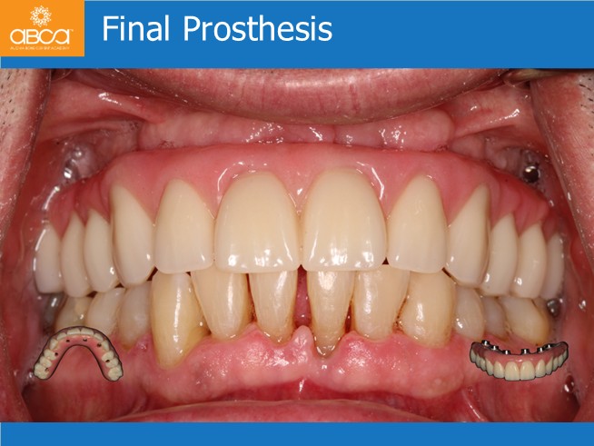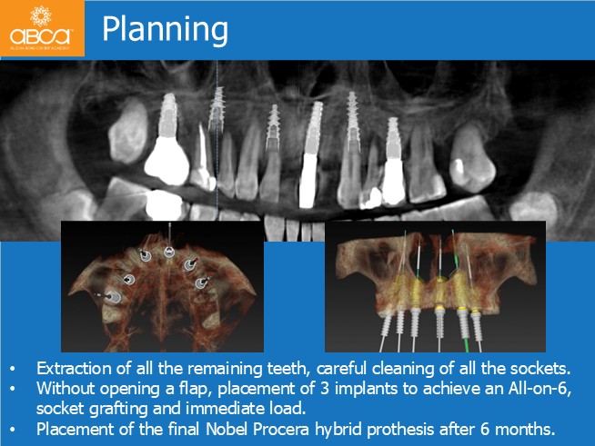 Treatment includes the extraction of all the remaining teeth, careful cleaning of all the sockets. Without opening a flap, placement of 3 implants to achieve an All-on-6, socket grafting and immediate load. Placement of the final Nobel Procera hybrid prothesis after 6 months.