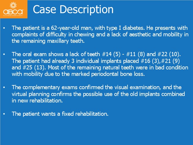 The patient is a 62-year-old man, with type I diabetes. He presents with complaints of difficulty in chewing and a lack of aesthetic and mobility in the remaining maxillary teeth. The oral exam shows a lack of teeth #14 (5) – #11 (8) and #22 (10). The patient had already 3 individual implants placed #16 (3),#21 (9) and #25 (13). Most of the remaining natural teeth were in bad condition with mobility due to the marked periodontal bone loss. The complementary exams confirmed the visual examination, and the virtual planning confirms the possible use of the old implants combined in new rehabilitation. The patient wants a fixed rehabilitation.