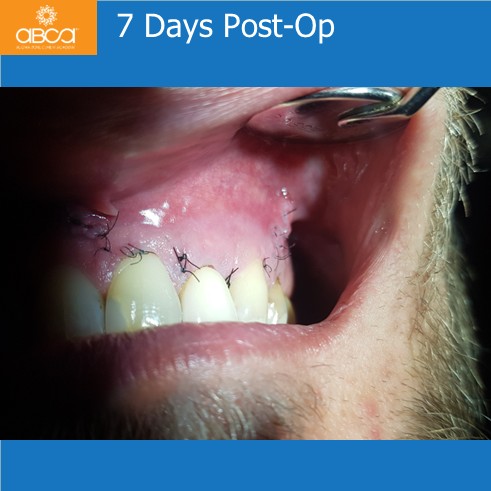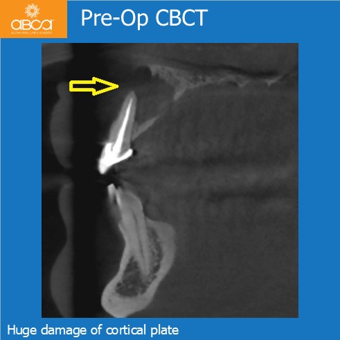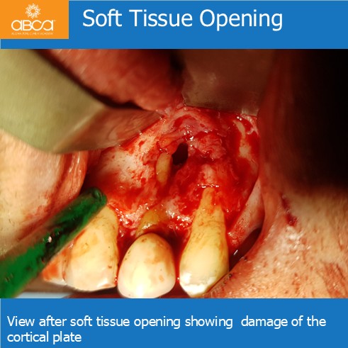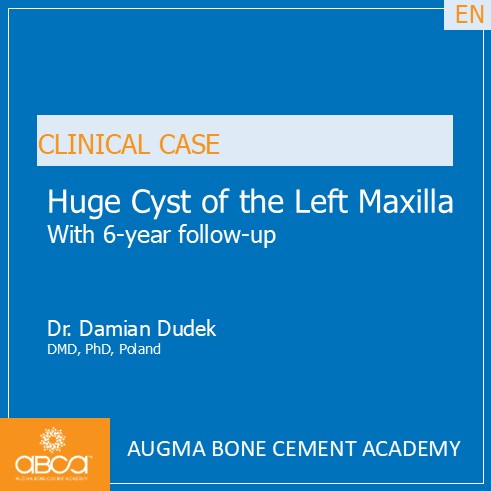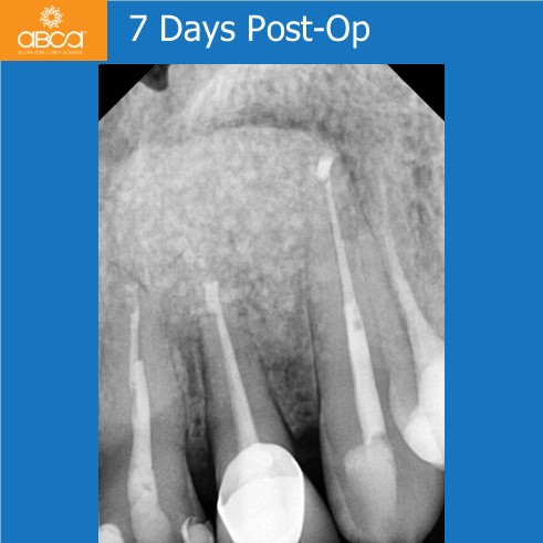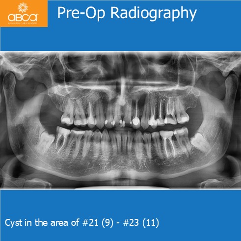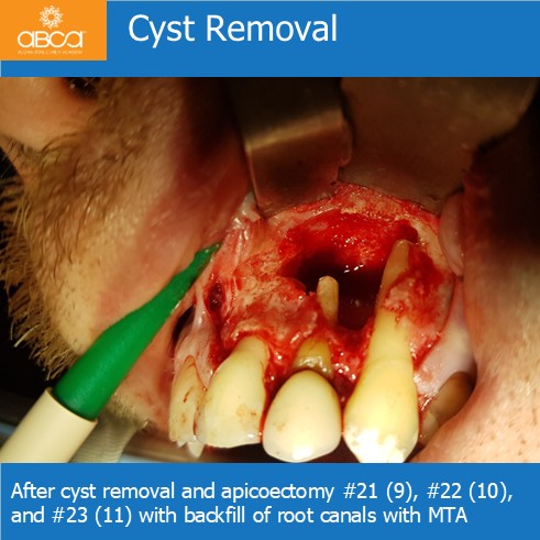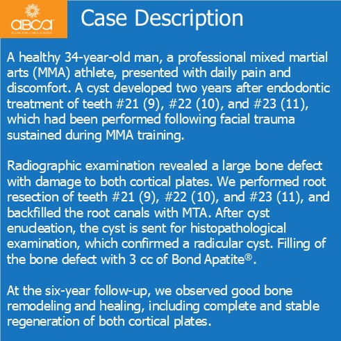 Radiographic examination revealed a large bone defect with damage to both cortical plates. We performed root resection of teeth #21 (9), #22 (10), and #23 (11), and backfilled the root canals with MTA. After cyst enucleation, the cyst is sent for histopathological examination, which confirmed a radicular cyst. Filling of the bone defect with 3 cc of Bond Apatite®.