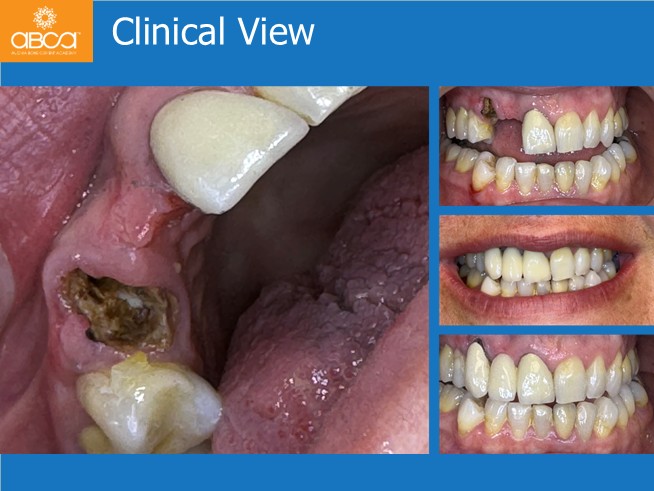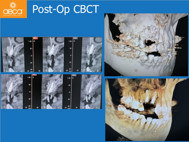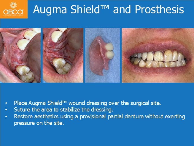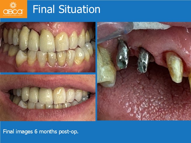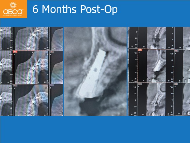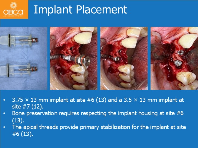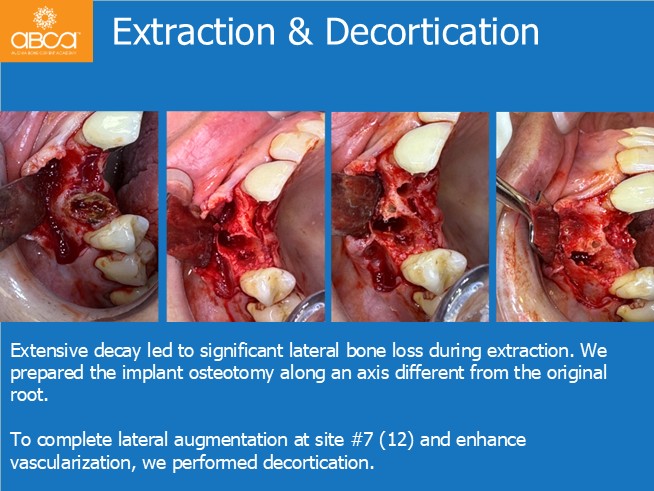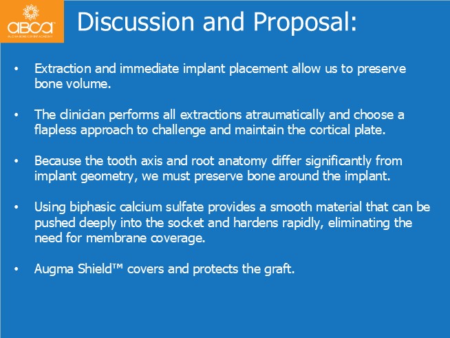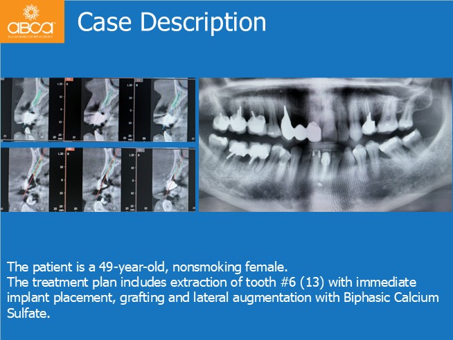 The treatment plan includes extraction of tooth #6 (13) with immediate implant placement, grafting and lateral augmentation with Biphasic Calcium Sulfate.