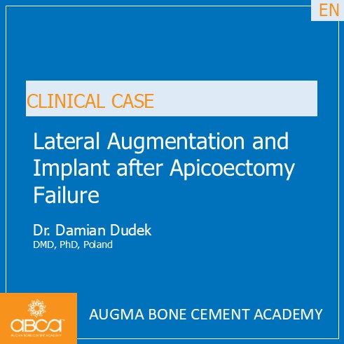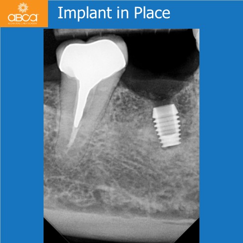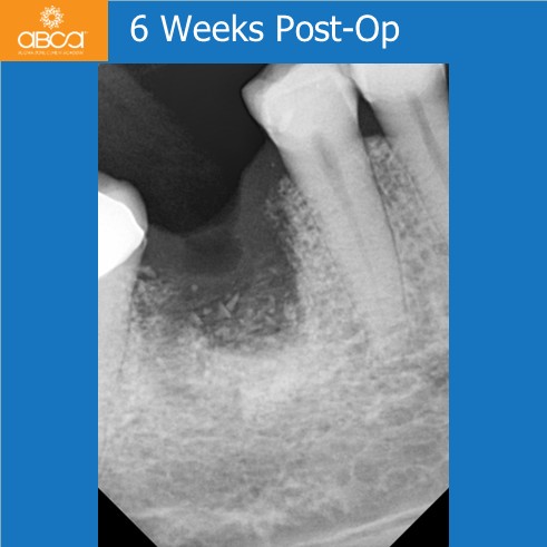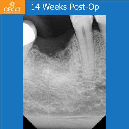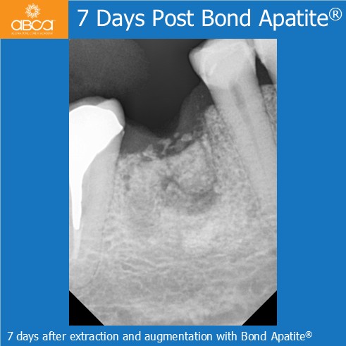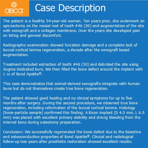 Treatment included extraction of tooth #46 (30) and debrided the site using Augma dedicated burs. We then filled the bone defect around the implant with 1 cc of Bond Apatite®.