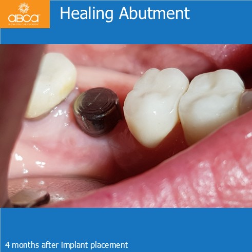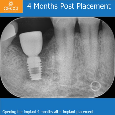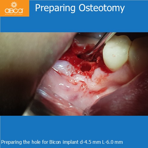 The patient showed good healing and no clinical symptoms for up to five months after surgery. During the second procedure, we observed true bone regeneration, including reformation of the buccal cortical lamina. Histology (bone-particle sample) confirmed this finding. A Bicon implant (D 4.5 mm, L 6.0 mm) was placed with excellent primary stability and strong bleeding from the internal bone during osteotomy preparation.