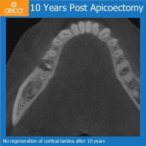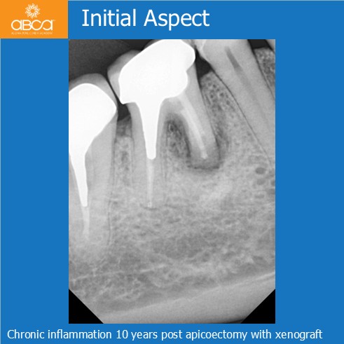Radiographic examination showed furcation damage and a complete lack of buccal cortical lamina regeneration, a decade after the xenograft based augmentation.