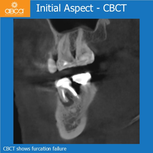 The patient is a healthy 54-year-old woman. Ten years prior, she underwent an apicoectomy on the mesial root of tooth #46 (30) and augmentation of the site with xenograft and a collagen membrane. Over the years she developed pain on biting and general discomfort.