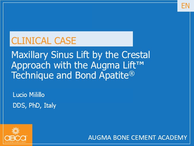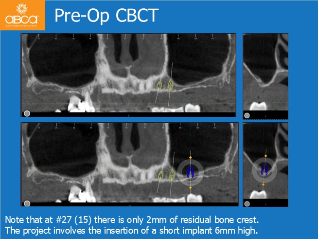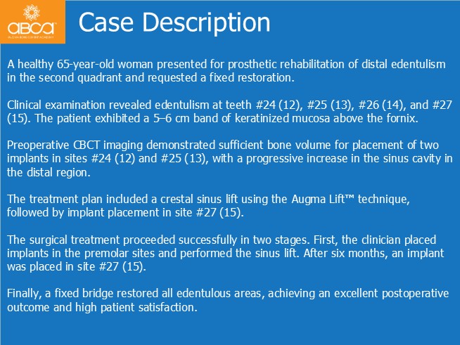 The treatment plan included a crestal sinus lift using the Augma Lift™ technique, followed by implant placement in site #27 (15).