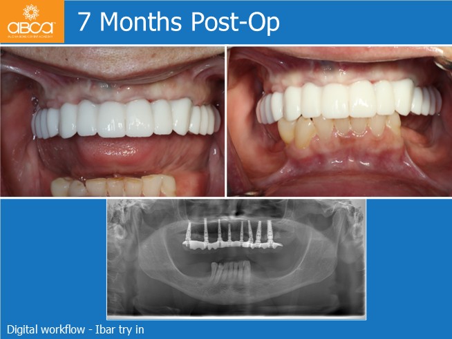 The first surgery is an All-on-X in the upper jaw. After a short period of healing, it was our objective to deliver the final prosthetics 7 months post-op.