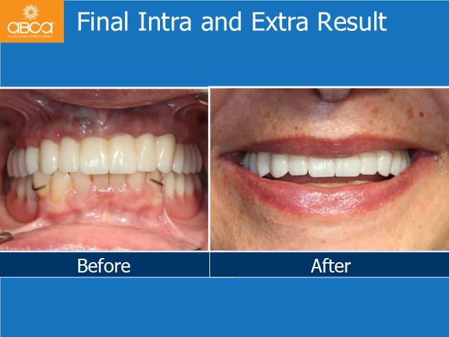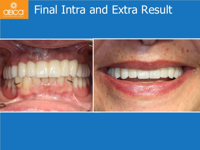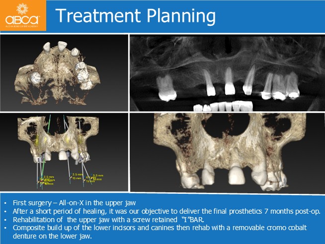 Next is the rehabilitation of the upper jaw with a screw retained “I”BAR. Composite build up of the lower incisors and canines then rehab with a removable cromo cobalt denture on the lower jaw.