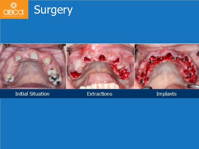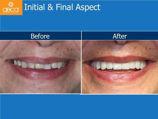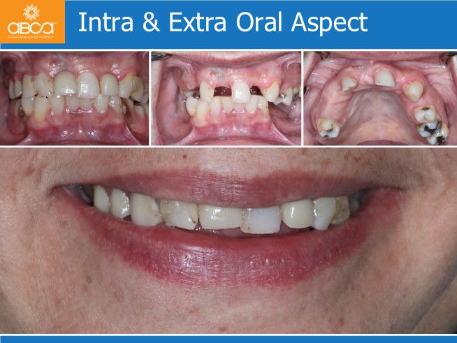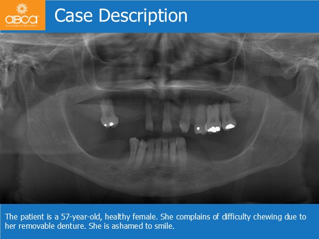 The patient is a 57-year-old, healthy female. She complains of difficulty chewing due to her removable denture. She is ashamed to smile.