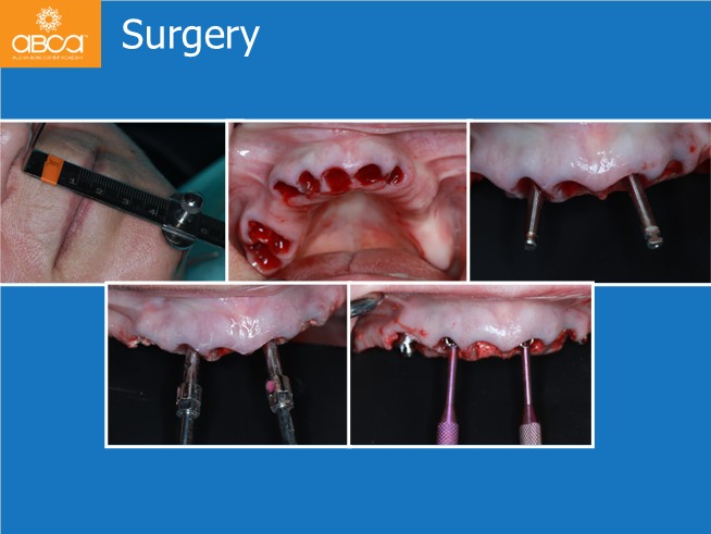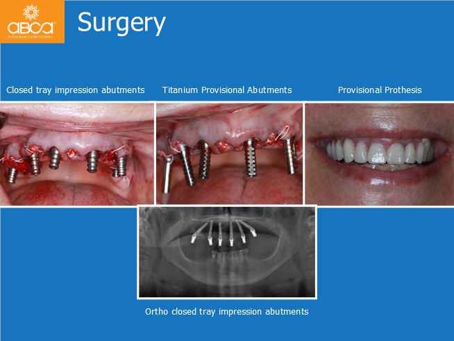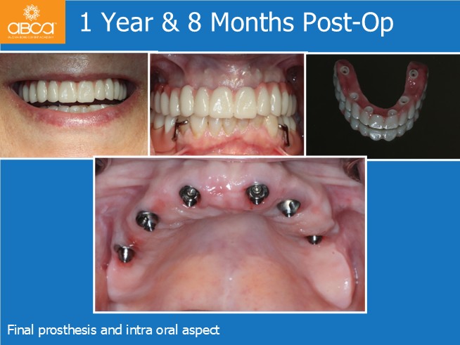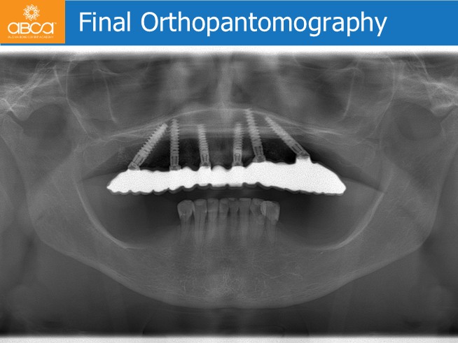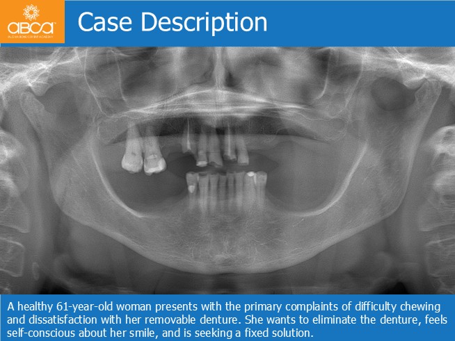 A healthy 61-year-old woman presents with the primary complaints of difficulty chewing and dissatisfaction with her removable denture. She wants to eliminate the denture, feels self-conscious about her smile, and is seeking a fixed solution.