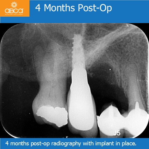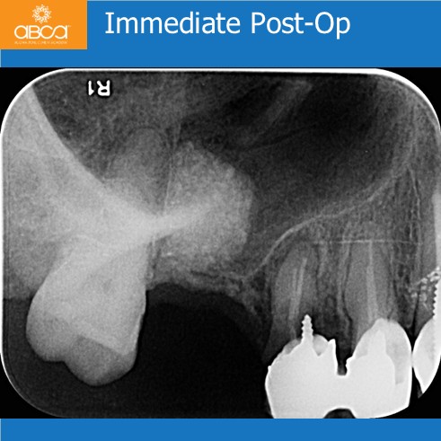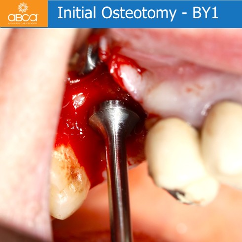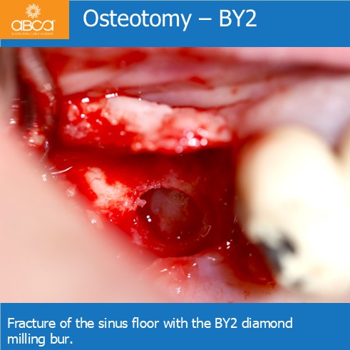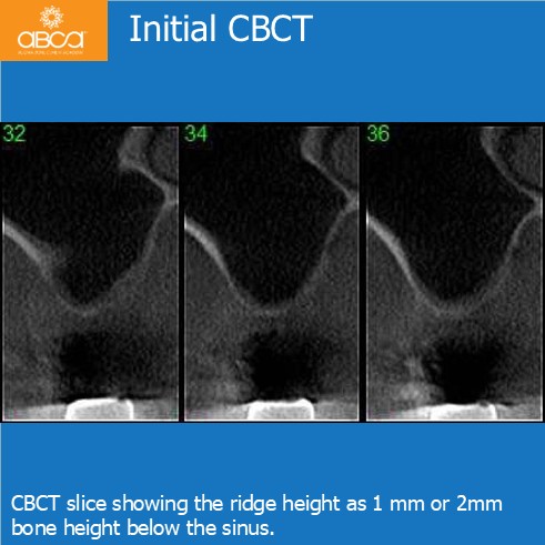Initial CBCT images show the estimated ridge height as 1-2mm below the sinus. The BY2 diamond milling bur breaks through the sinus floor. Following the Augma Lift™ technique protocol, membrane elevation and augmentation are performed. Radiography shows implant placement 4 months post-op in newly formed bone.